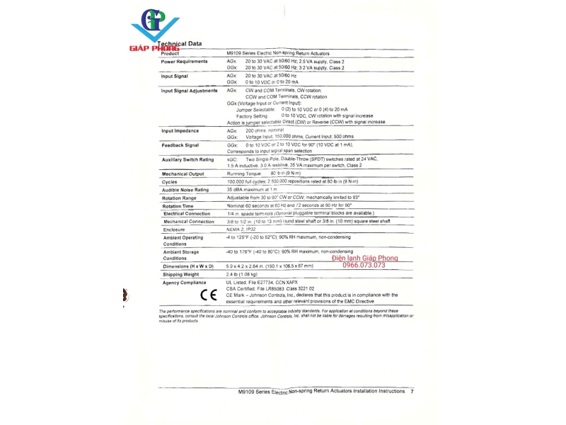 * Tín hiệu phản hồi (Feedback): 0-10 VDC hoặc 2-10 VDC (tương ứng với góc quay 90°).